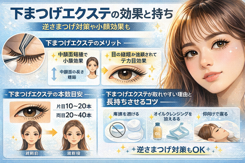 下まつげエクステの効果と持ち|逆さまつげ対策や小顔効果も徹底解説