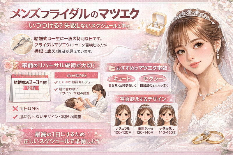 結婚式は、人生で最も特別で美しい瞬間を写真や記憶に残す大切な一日です。そのため、花嫁の美容準備として「ブライダルマツエク(マツエク 結婚式)」を取り入れる人が非常に増えています。 普段はマスカラ派の人でも、結婚式では「感動して泣いてもパン... -