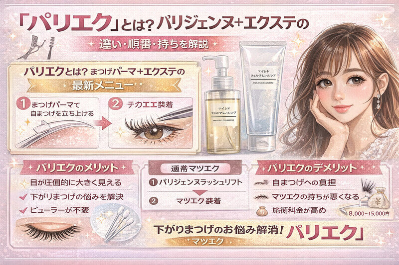 「マツエクをしても、なんだか目が小さく見える」「まつげが下向きに生えていて、視界にエクステがかぶってしまう」 このような目元のお悩みを抱えていませんか?近年、まつげ美容の新しい定番として大きな注目を集めているのが「パリエク」です。SNSや美... -