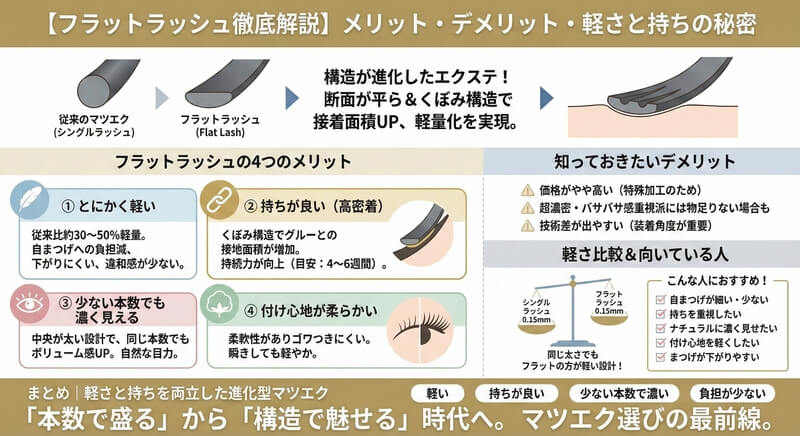 「サロンのメニューでよく見る『フラットラッシュ』って、一体何が違うの?」「持ちが良くて軽いって本当?デメリットはないの?」 マツエクの主流になりつつある革新的な技術、フラットラッシュ。その名前は耳にしたことがあっても、具体的な特徴やメリッ...