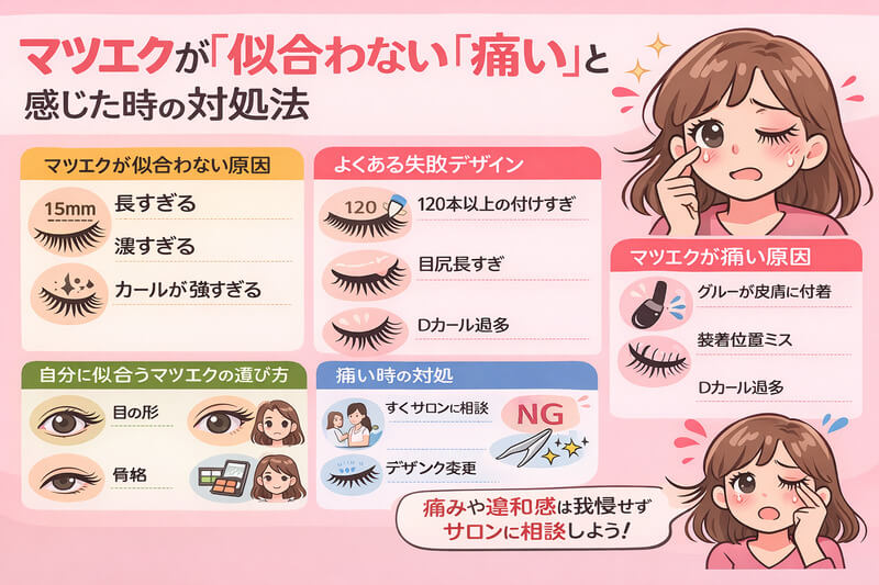 「せっかくマツエクをしたのに、なんだか自分の顔に似合わない」「目元がケバい印象になってしまった」「まぶたがチクチクして痛い」といった悩みを抱えている方は少なくありません。初めてのマツエクや、いつもと違うデザインに挑戦した際に、こうした違... -