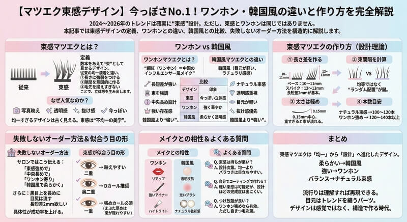 「最近SNSでよく見る『束感まつげ』ってどうやってオーダーするの?」「中華美女みたいな『ワンホンマツエク』に憧れるけど、派手になりすぎないか心配」「韓国アイドルみたいなナチュラルな束感と、ワンホンの違いがいまいち分からない」 2024年から2026... -