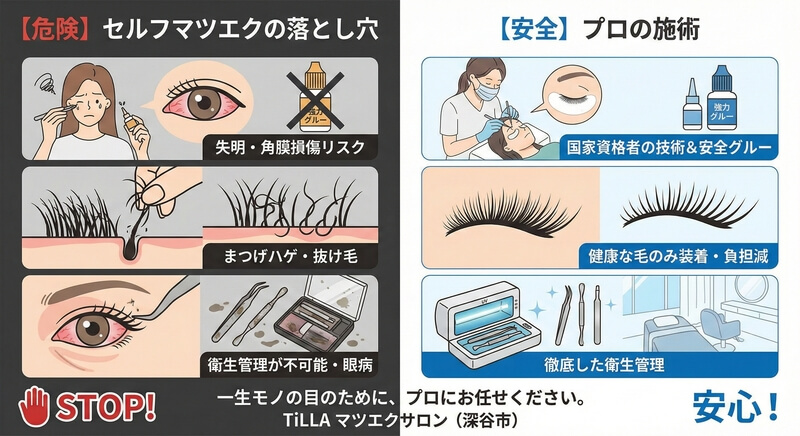 【プロは絶対やりません】セルフマツエクの危険性と失敗リスク。「節約」の代償に失うものが大きすぎる理由