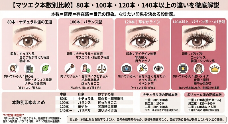 【マツエク本数別比較】80本・100本・120本・140本以上の違いを徹底解説!ナチュラル?バサバサ?あなたの正解本数は何本?