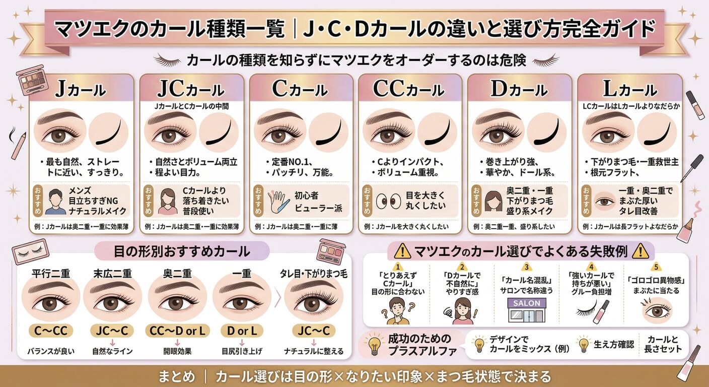 マツエクのカール種類と選び方のポイントをまとめると以下の通りです。